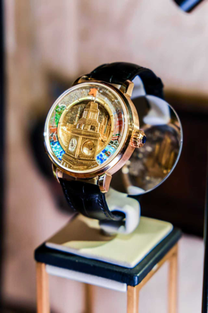 其中,上海表复兴·上海之晨由上海表与金雕大师梅花联袂打造,全球限量7枚。该表融合黄金微雕、马赛克微镶宝石与三问报时三大复杂工艺,致敬外滩海关大楼百年钟声及其所承载的城市记忆。表盘采用特殊分层结构,以18K黄金微雕凸显江海关大楼,背景以精细雕工勾勒出陆家嘴天际线与黄浦江景,构成一幅生动的都市画卷。
